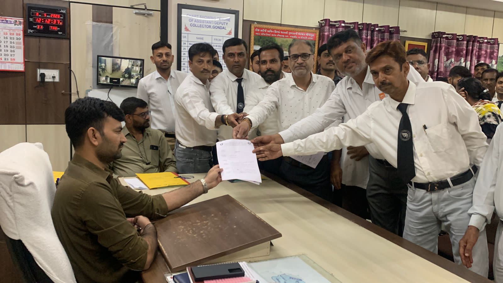 ચકચારી અમીત ખુંટ આપઘાત પ્રકરણ માં બે વકીલોની ધરપકડ નાં વિરોધ માં ગોંડલ બાર એસોસિએશન દ્વારા પ્રાંત અધિકારી ને આવેદનપત્ર અપાયુ.