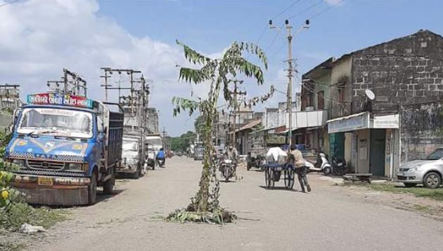 Dhoraji-Rajkot ધોરાજી નગરપાલિકા અને સરકારી તંત્ર તૂટેલા ફૂટેલા માર્ગોની વહેલાસર મરામત કરાવે તેવી માંગ સાથે રોડ ઉપર ઝાડ ઉગાડી અલગ પ્રકારનો વિરોધ.