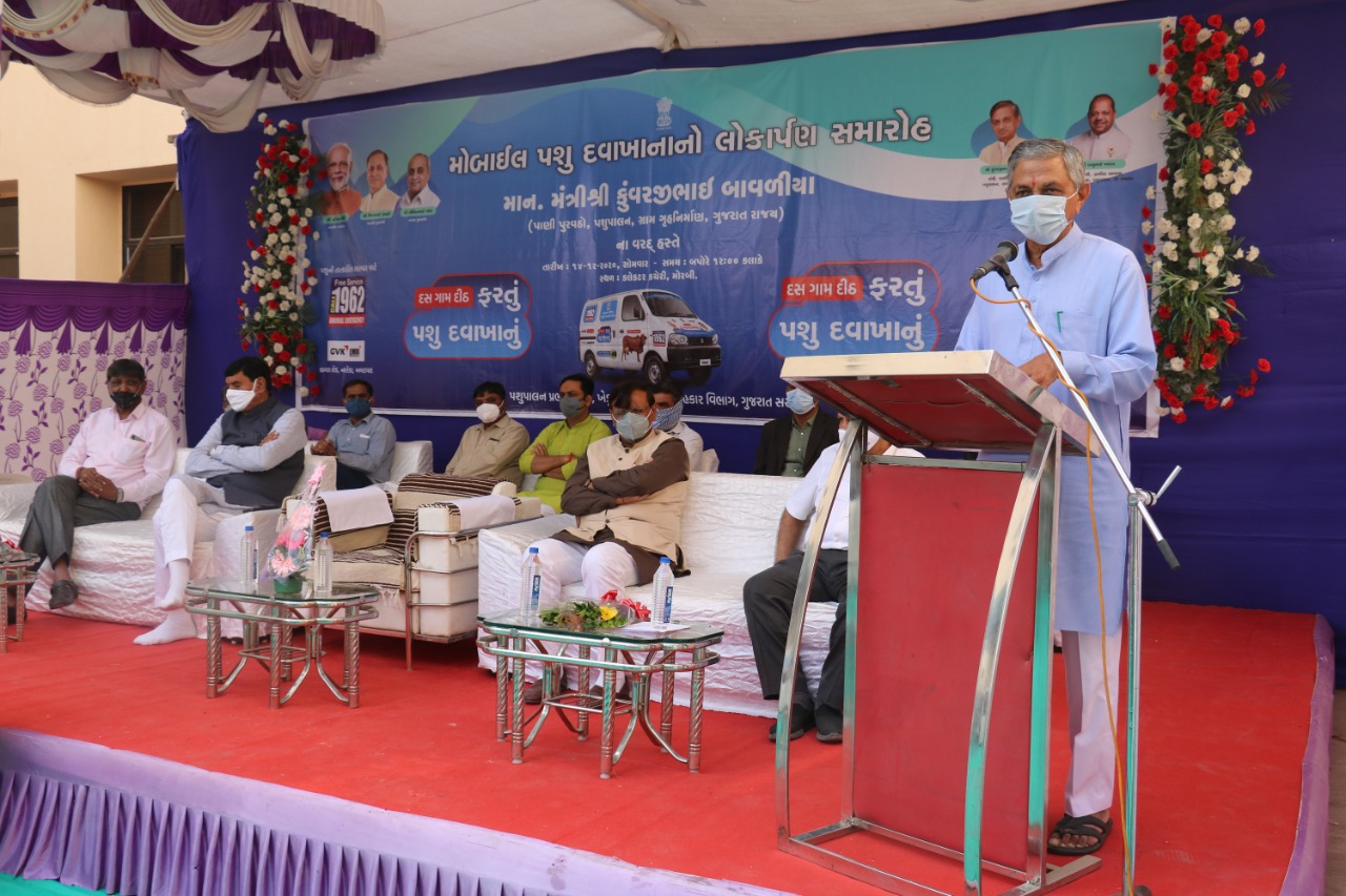 Morbi-માંન.મંત્રીશ્રી કુંવરજીભાઈબાવળીયા સાહેબના હસ્તે ફ્લેગ ઓફ આપીને મોરબી ખાતે ત્રીજા તબક્કામાં મોબાઈલ પશુ દવાખાનાનું લોકાર્પણ.