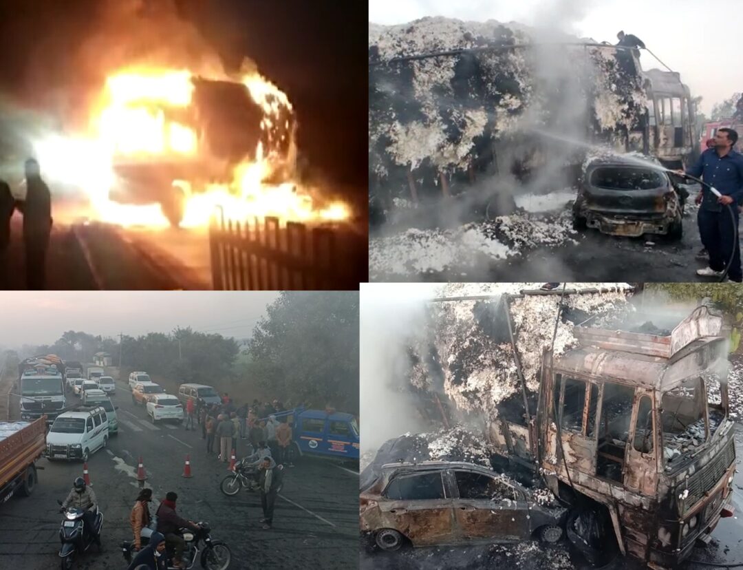 Gondal-Rajkot ગોંડલ નજીક કાર-ટ્રક વચ્ચે અકસ્માત સર્જાતા લાગી આગ, કારમાં સવાર ત્રણ લોકોના મોત.