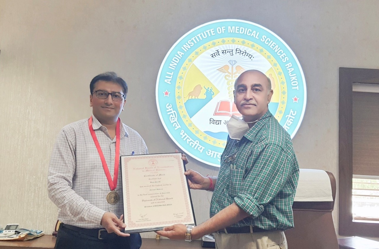 ઓલ ઈન્ડિયા ઈન્સ્ટીટ્યુટ ઓફ મેડિકલ સાયન્સીઝ (AIIMS), રાજકોટ ખાતે ફોરેન્સિક મેડિસિન એન્ડ ટોક્સિકોલોજી વિભાગના ડો. ઉત્સવ નીતિનકુમાર પારેખને તેમની સ્પેશીયાલીટી ફોરેન્સિક મેડિસિન એન્ડ ટોક્સિકોલોજીમાં શ્રેષ્ઠ પરફોર્મન્સ બદલ નવી દિલ્હી ખાતે યોજાયેલ નેશનલ બોર્ડ ઓફ એક્ઝામિનેશન્સ ઈન મેડીકલ સાયન્સીઝ (NBEMS) ના ૨૧મા દીક્ષાંત સમારોહમાં ડિપ્લોમેટ ઓફ નેશનલ બોર્ડ (DNB) ની ડિગ્રી એનાયત થવા સાથે ગોલ્ડ મેડલથી સન્માનિત કરવામાં આવ્યા હતા. તેમણે જૂન ૨૦ સત્રમા એઈમ્સ, નવી દિલ્હી ખાતે આયોજિત નેશનલ લેવલની પરીક્ષામાં ઉચ્ચતમ ગુણ પ્રાપ્ત કર્યા હતા.