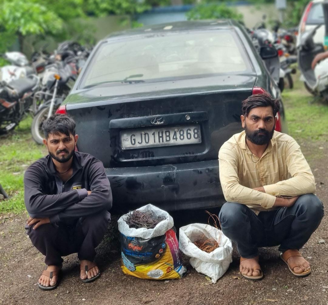 પ્રાપ્ત વિગતો મુજબ ગોંડલ સીટી પીઆઇ સંગાડા પોલીસ કોન્સ્ટેબલ મયુર સિંહ જાડેજા યુવરાજસિંહ ગોહિલ સહિતનાઓ એ બાતમીના આધારે ગોંડલ તાલુકાના જામવાડી ગામે રહેતા જહાંગીર અબ્રાહમ ભાઈ રાઉકેડા તેમજ અજયસિંહ ભીખુભા સોઢા રહે સાપર આદર્શ સોસાયટી દેવાંગ ટાઉનશીપ વાળા hyundai કંપનીની gj 1hb 4868 માં બેસીને ચોરીના વાયર માંથી ઉપર કાઢી રોમાં ટોકીઝ ના પાછળ ભંગારના ડેલામાં વેચવા આવ્યા હોય પોલીસે બંનેને ઝડપી લઇ કાર સહિત કુલ મુદ્દા માલ ₹1,59,500 કબજે કરી કાર્યવાહી હાથ ધરી હતી.