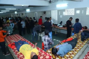 રાજ્યમાં વધી રહેલા રોગચાળાના કપરા સમયમાં યુવાનોએ ગોંડલની પટેલ વાડી જેલ ચોક ખાતે સર્વે સમાજ માટે તાકીદે રક્તદાન કેમ્પનું આયોજન કરી 297 યુનિટ રક્ત એકઠું કર્યું હતું. ‘યુદ્ધ એ જ કલ્યાણ’ ગૃપ દ્વારા ત્રણ માસ પહેલા પણ રક્તદાન કેમ્પનું આયોજન કરી 5128 યુનિટ રક્ત એકત્રિત કરવામાં આવ્યું હતું.