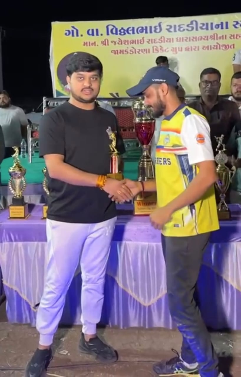 જેમને લઈને જામકંડોરણા ખાતે સ્વ.વિઠ્ઠલભાઈ રાદડીયાની સ્મૃતિમાં યોજાયેલ રાત્રી ક્રિકેટ ટુર્નામેન્ટમાં યદુનંદન ઈલેવન રાજકોટના વિજય અને સેકન્ડ રનર્સ અપ તરીકે રાજશક્તિ રીબડાનો વિજય થતા તેમને ધારાસભ્ય જયેશભાઈ રાદડીયા,રીબડાના રાજદીપસિંહ અનિરુદ્ધસિંહ જાડેજાના હસ્તે ટ્રોફીઓ એનાયત કરવામાં આવી હતી.