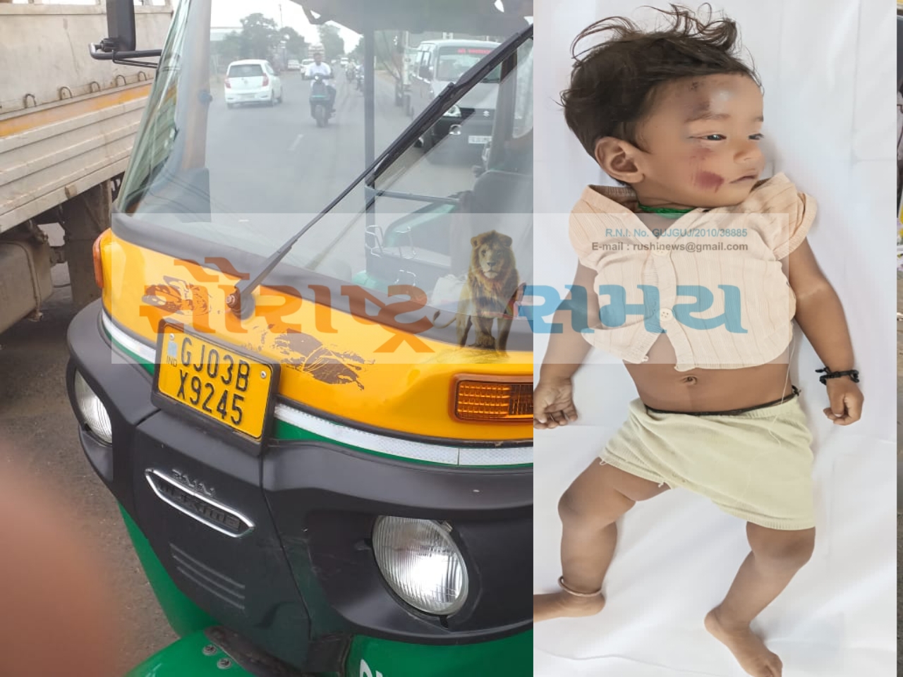 પ્રાપ્ત વિગત મુજબ બપોર ના સુમારે ગોંડલ ગુંદાળા રોડ પર ડેકોરાસીટી પાસે મુસાફરો ભરી પસાર થઈ રહેલી જીજે.ઓ૩બીએકસ ૯૨૪૫ નંબર ની રીક્ષા ચાલકે આગળ જઈ રહેલા બાઇક ને ઠોકર મારતા અને રીક્ષા પર થી કાબુ ગુમાવતા રીક્ષા પલટી ખાઇ ગઇ હતી.અકસ્માત મા રીક્ષા મા મુસાફરી કરી રહેલા મુળ દાહોદ અને હાલ નેશનલ હાઇવે ગેલેક્સી પંપ પાછળ રહેતા દશરથભાઇ ડામોર ના સાત માસ નાં પુત્ર નિતિન નુ ગંભીર ઇજાને કારણે મોત નિપજ્યુ હતુ. જ્યારે અન્ય લોકોને સામાન્ય ઇજા પહોંચી હતી