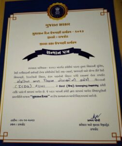 જે પૈકી રાજકોટ જિલ્લા સંકલિત બાળ વિકાસ સેવાઓ (I.C.D.S.)ની કચેરીની જિલ્લાની શ્રેષ્ઠ કચેરી તરીકે પસંદગી કરવામાં આવી હતી. તેથી, જિલ્લા કલેકટરશ્રી પ્રભવ જોષી તથા જિલ્લા વિકાસ અધિકારીશ્રી દેવ ચૌધરીના હસ્તે તેમજ નિવાસી અધિક કલેકટરશ્રી એસ. જે. ખાચરની ઉપસ્થિતિમાં પ્રોગ્રામ ઓફિસરશ્રી સાવિત્રીબેન નાથજીને સન્માનપત્ર આપવામાં આવ્યું હતું.